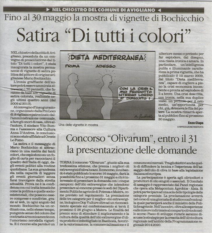 Oggi, lunedì 19 maggio, alle ore 18.30, nel chiostro della città di Avigliano, preceduta da un convegno di presentazione dal titolo “Di tutti i colori”, verrà inaugurata del pittore di origine aviglianese Mario Bochicchio. L'ironia graffiante dell’autore potrà essere ammirata attraverso i 70 pannelli, che faranno da base alle vignette di satira colorata, realizzate negli ultimi quattro anni (dal 2009 al 2013). Al convegno d’inaugurazione, organizzato dalla Pro Loco di Avigliano e patrocinato dall’Amministrazione comunale, saranno presenti, oltre all’autore, il sindaco Vito Summa e l’assessore alla cultura Anna D’Andrea. La satira e il messaggio di Mario Bochicchio si abbracciano in una matita dai tanti colori, che esplodono su un foglio di carta per raccontarci il quadro dell’Italia di oggi, dagli eventi politici alla routine quotidiana. La sua grandezza sta nella capacità di leggere gli eventi giornalieri senza farsi travolgere dalla stretta attualità. Prova ne è la confidenza con cui tratta tematiche come la politica e quelle socio-esistenziali, che possono essere comprese e condivise, grazie al web, in ogni angolo del mondo. Bochicchio ha un ordinato ma, nello stesso tempo, pungente senso del colore che contrasta armonicamente con l’umorismo nero della vignetta. E il ricorso alla parola è un ulteriore mezzo e pretesto per far esplodere, dal disegno, una risata ironica e amara. In particolare, un’intelligenza pulita e illuminante caratterizza la prima vignetta, che ha pubblicato il 10 marzo 2009, dal titolo “dieta mediterranea”, capace di cogliere a pieno la crisi economica incombente e pronta ad esplodere di lì a breve. Una crisi descritta, con ironia, nella sua duplice veste: un pericolo per il ceto medio, un’opportunità per chi, già, deteneva le fila del potere. La mostra rimarrà aperta al pubblico fino al 30 maggio. |