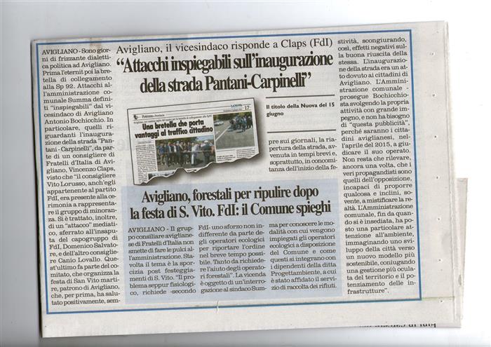 Sono inspiegabili gli attacchi, condotti attraverso i giornali, contro l’Amministrazione comunale e, in particolare, quelli riguardanti l’inaugurazione della strada "Pantani - Carpinelli", da parte di un consigliere di Fratelli d’Italia di Avigliano, Vincenzo Claps, visto che il consigliere Vito Lorusso, anch’egli appartenente al partito FdI, era presente alla cerimonia a rappresentare il gruppo di minoranza. Si è trattato, inoltre, di un “attacco” mediatico, sferrato all’insaputa del capogruppo di FdI, Domenico Salvatore, e dell’altro consigliere Canio Lovallo. Quest’ultimo fa parte del comitato, che organizza la festa di San Vito martire, patrono di Avigliano, che, per prima, ha salutato positivamente, sempre sui giornali, la riapertura della strada, avvenuta in tempi brevi e, soprattutto, in concomitanza dell’inizio della festività, scongiurando, così, effetti negativi sulla buona riuscita della stessa. L’inaugurazione della strada era un atto dovuto ai cittadini di Avigliano. L’Amministrazione comunale sta svolgendo la propria attività con grande impegno, e non ha bisogno di “questa pubblicità”, perché saranno i cittadini aviglianesi, nell’aprile del 2015, a giudicare il suo operato. Non resta che rilevare, ancora una volta, che i veri propagandisti sono quelli dell’opposizione, incapaci di proporre qualcosa e inclini, sovente, a mistificare la realtà. L’Amministrazione comunale, fin da quando si è insediata, ha posto una particolare attenzione all’ambiente, immaginando uno sviluppo della città verso un nuovo modello più sostenibile, coniugando una gestione più oculata del territorio e il potenziamento delle infrastrutture.