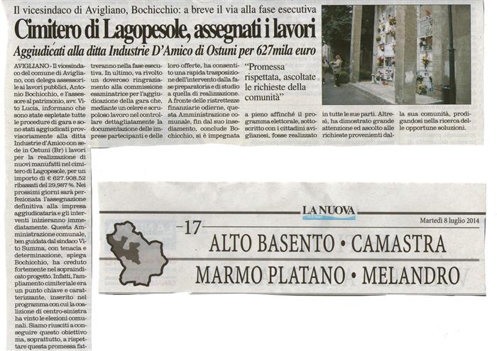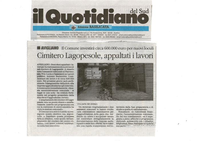 Il vicesindaco del comune di Avigliano, con delega assessorile ai lavori pubblici, Antonio Bochicchio, e l’assessore al patrimonio, avv. Vito Lucia, informano che sono state espletate tutte le procedure di gara e sono stati aggiudicati provvisoriamente alla ditta Industrie d'Amico con sede in Ostuni (BR) i lavori per la realizzazione di nuovi manufatti nel cimitero di Lagopesole, per un importo di € 627.908.52 ribassati del 29,987 %. Nei prossimi giorni sarà perfezionata l’assegnazione definitiva alla impresa aggiudicataria e gli interventi inizieranno immediatamente. Questa Amministrazione comunale, ben guidata dal sindaco Vito Summa, con tenacia e determinazione, ha creduto fortemente nel sopraindicato progetto. Infatti, l’ampliamento cimiteriale era un punto chiave e caratterizzante, inserito nel programma con cui la coalizione di centro-sinistra ha vinto le elezioni comunali. Siamo riusciti a conseguire questo obiettivo ma, soprattutto, a rispettare questa promessa fatta ai cittadini, come quella dell’ampliamento del cimitero del centro cittadino, i cui lavori, a breve, entreranno nella fase esecutiva. In ultimo, va rivolto un doveroso ringraziamento alla commissione esaminatrice per l’aggiudicazione della gara che, mediante un celere e scrupoloso lavoro nel controllare dettagliatamente la documentazione delle imprese partecipanti e delle loro offerte, ha consentito una rapida trasposizione dell’intervento dalla fase preparatoria e di studio a quella di realizzazione. A fronte delle ristrettezze finanziarie odierne, questa Amministrazione comunale, fin dal suo insediamento, si è impegnata a pieno affinché il programma elettorale, sottoscritto con i cittadini aviglianesi, fosse realizzato in tutte le sue parti. Altresì, ha dimostrato grande attenzione ed ascolto alle richieste provenienti dalla sua comunità, prodigandosi nella ricerca delle opportune soluzioni.