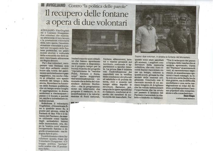 Avigliano: Vito Guglielmi e Luciano Guappone, due volontari che stimolano attraverso il loro lavoro e la prestazione volontaria della loro opera, l’amministrazione comunale a puntare sul recupero delle fontane pubbliche, un patrimonio storico e culturale della comunità che deve essere valorizzato attraverso un degno decoro. Per i due volontari, recuperare una fontana non vuol dire soltanto contribuire alla tutela del patrimonio architettonico e paesaggistico, ma anche ridare ai cittadini uno spazio simbolo del tempo e della storia. Ricordano la funzione delle fontane pubbliche che un tempo erano luoghi di aggregazione: le donne andavano a risciacquare i panni e il bucato e perché no, anche a intrattenere relazioni sociali. Per meglio capirci, sottolinea il volontario Guglielmi: “Quelle che oggi chiameremo chiacchiere da salotto.” – Continua – “Dimenticate fino a qualche anno fa, a punto per alcune, come la fontana di San Vito e il lavatoio del Pantano, da essere utilizzate come vasche degli antiestetici bidoni delle immondizie, ora, dopo la "nostra cura" stanno recuperando fascino e dignità ornamentale – ma bisogna fare di più”.Va sottolineata e deve far riflettere questa frase del Volontario Guappone – “C’è troppa politica “parlata” nelle nostre vite. E pochissimi fatti”. E’ in quest’ottica che stanno operando i due volontari e anche quei cittadini che hanno spontaneamente messo a disposizione il proprio tempo per la buona riuscita del progetto “ripristiniamo le “vecchie Fonti, fontane e fontanons” anche supportati dall’amministrazione comunale che a detta del vicesindaco Antonio Bochicchio – “ha in programmazione un intervento che propone il restauro, la riqualificazione e la valorizzazione di fonti naturali, fontane, abbeveratoi, lavatoi e vasche presenti sul territorio comunale e appartenenti a epoche remote. La prima fase è iniziata con l’individuazione dei manufatti con la verifica delle condizioni strutturali ed estetiche e di pulizia da terra, rovi e quanto nel tempo abbia sepolto le strutture. Saranno, poi, eseguite le opere specifiche di restauro, conformi al rispetto dei caratteri di autenticità dei manufatti. Per questo sono stati ascoltati gli anziani, i migliori conservatori della memoria collettiva, che con i loro ricordi hanno raccontato come un tempo, intorno a questi punti, girasse la vita sociale della nazione aviglianese. Concludo con il racconto morale di un anziano longevo di Avigliano che ha voluto testimoniare l’importanza che ha avuto nel passato il lavatoio del Pantano (raccontato in dialetto e tradotto in italiano): “Tra lo sciacquio dei panni e l'acqua delle vasche che si andava sporcando, l'area del “Pantano” si animava di voci, si raccontavano esperienze, si scambiavano opinioni e tanti consigli: la vita non era certo facile tra le due guerre, ma le difficoltà quotidiane e una certa rassegnazione ai colpi del destino predisponevano l'animo popolare alla comprensione e alla consolazione.”.