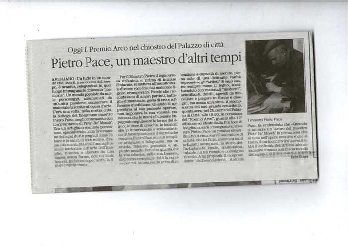 Un tuffo in un mondo che, con il trascorrere del tempo, è svanito, relegandosi in quel luogo immaginario chiamato “memoria”. Un mondo popolato da mille personaggi, accumunati da un’unica passione: consacrare il materiale lavorato ad opera d’arte. C'era una volta, nella nostra città, la bottega del falegname Maestro Pietro Pace, meglio conosciuto con il soprannome di Pietr’ Re’ Mosch’. Era un artigiano ebanista portentoso, specializzato nella lavorazione dei legni duri e pregiati come l’ebano e le radici di noce e olivo. Grazie alla sua abilità ed all’immaginazione istrionica nell’arte dell’intaglio, riusciva a liberare da una massa senza forma, con un lento lavorio, incisione dopo l’altra, la figura imprigionata. Per il Maestro Pietro il legno aveva un’anima e, prima di iniziare l’intarsio, si metteva all’ascolto delle diverse voci che, dal materiale ligneo, erompevano. Parole che raccontavano di amori perduti, battaglie dimenticate, gesta di eroi e sofferenze quotidiane. Quando si apprestava al suo paziente operare, non imponeva la sua volontà, ma lasciava che le mani e l’utensile impugnato seguissero le forme del legno, le linee di crescita, le tensioni che lo innervavano e sostanziavano. E forse questo era il segreto che rendeva Pietro Pace non un semplice artigiano o falegname, ma un artista. Silenzio, pazienza e, appunto, ascolto. Sono tre qualità che la vita odierna, nella sua frenesia, disprezza e respinge. Ed è la ragione per cui, in una realtà priva di attenzione e capacità di ascolto, piena solo di una delirante vanità espressiva, gli “artisti” di oggi usano sempre meno il legno, sostituendolo con materiali “moderni”, scintillanti, duttili, agevoli da modellare e piegare in forme e disegni, ma senza un’anima. A riconoscenza del suo grande contributo, questa sera, nel Chiostro del Palazzo di Città, alle ore 18.30, in occasione del “Premio Arco”, giunto alla 17° edizione ed ideato dalla Pro loco di Avigliano, sarà consegnato al Maestro Pietro Pace un premio straordinario, a rimarcare il suo valore di artista, che ha fatto, insieme a tanti artigiani scomparsi, la storia dell’artigianato locale, tramutatosi, intanto, in un remoto e nostalgico ricordo. A tal proposito il vicepresidente dell’associazione, Antonio Pace, ha evidenziato che – “ Quando si ammira un lavoro del maestro Pietr’ Re’ Mosch’ - "La prima cosa che si nota nell’opera creativa è che si tratta di un incontro tra la creatività è il confronto dell’artista intensivamente conscio con il suo mondo del legno".