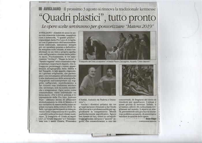 Avigliano. Allestiti di anno in anno con crescente interesse, maggiore cura e solennità, “I quadri plastici”, organizzati dalla Pro Loco di Avigliano con il patrocinio dell’Amministrazione comunale, assumono sempre più un carattere preciso e definitivo: da semplice culto rituale, si sono trasformati in un vero e proprio spettacolo raffigurativo vivente della pittura sacra. Puntualmente, le tre associazioni Aviliart, Basso la Terra e Spazio Ragazzi sono chiamate a rappresentare importanti dipinti, che ritraggono personaggi o scene appartenenti all’agiografia della Bibbia e del Vangelo. A tale appello, in particolare, rispondono i giovani aviglianesi, che partecipano con entusiasmo all’allestimento e alla realizzazione delle scenografie. Orgogliosi nell’interpretare un soggetto raffigurato, contribuiscono a far rivivere una tradizione secolare che, nel tempo, non ha subito modifiche e sospensioni. Ogni anno, come consuetudine, viene individuato un tema sacro. “Per il 2014- precisa il vicepresidente Antonio Pace- “la Pro loco aviglianese ha deciso di affiancare simbolicamente la città di Matera e il suo tentativo di essere scelta come capitale europea della cultura 2019. Infatti, i gruppi partecipanti si cimenteranno nella trasposizione di 3 quadri, custoditi nelle principali chiese materane: Il trasporto di Cristo al sepolcro di Antonio Ciseri (1821-1891), Chiesa di San Francesco di Paola (Matera), a cura del Gruppo Aviliart; Cristo deposto (intorno al 1614) di Giovanni Donato Oppido, Chiesa di San Domenico (Matera), a cura del Gruppo Spazio Ragazzi; Immacolata con i Santi Chiara, Francesco d’Assisi, Antonio da Padova e Domenico di Francesco Celebrano (1729-1814), Cattedrale Santa Maria Assunta, Irsina (MT), a cura del Gruppo Basso la Terra.” “Sarà una lotta alla pari- aggiunge ancora il vicepresidente Pace- che impegnerà le associazioni nel dare il meglio nella rappresentazione della tavola a loro assegnata. Anche i direttori artistici dei tre gruppi saranno chiamati a dar fondo alla loro arte e professionalità per aggiudicarsi la competizione. Sfondi particolarmente significativi, figure ben dosate di luci, colori in un’equilibrata armonia saranno i ‘piccoli’ segreti, che consentiranno, ad uno dei concorrenti, di fregiarsi del titolo di vincitore per quest’anno. L’attesa è quasi giunta al termine. Infatti, il 3 agosto, alle 21.30, nella piazza Aviglianesi nel Mondo, il sipario si alzerà, permettendo alla giuria qualificata, e, soprattutto, al numeroso pubblico presente, di ammirare e valutare la qualità eccelsa delle opere.”