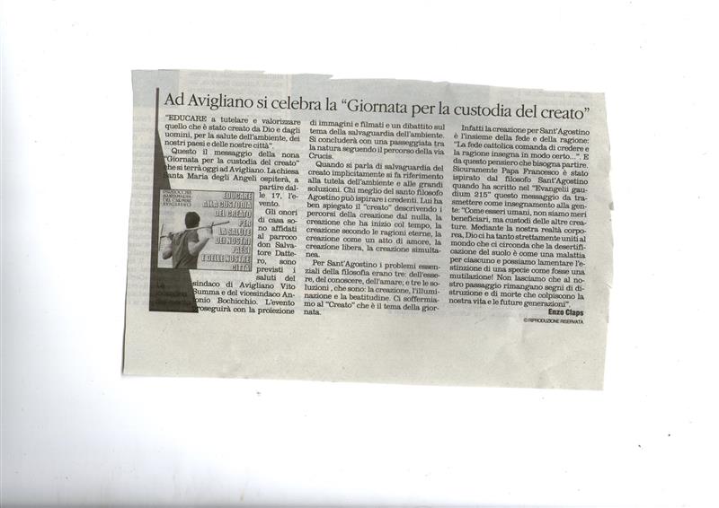 “Educare a tutelare e valorizzare quello che è stato creato da Dio e dagli uomini, per la salute dell’ambiente, dei nostri paesi e delle nostre città” questo è il messaggio che vuole veicolare la 9ª Giornata per la custodia del creato che si terrà in tutto il mondo il 1° settembre 2014, diffuso congiuntamente dalla Commissione Episcopale per l’Ecuminismo e il dialogo Interreligioso e la Commissione Episcopale per i Problemi Sociali e il Lavoro, la Giustizia e la Pace. Anche il territorio aviglianese celebra questa sera la giornata della “Salvaguardia del Creato” e lo fa attraverso la proposta lanciata dal parroco della città. La chiesa Santa Maria degli Angeli ospiterà a partire dalle ore 17,00 l’evento. Gli onori di casa sono affidati al parroco don Salvatore Dattero, sono previsti i saluti del sindaco di Avigliano Vito Summa e del vicesindaco Antonio Bochicchio. L’evento proseguirà con la proiezione di immagini e filmati e un dibattito sul tema della salvaguardia dell’ambiente. Si concluderà con una passeggiata tra la natura seguendo il percorso della via Crucis. Quando si parla di salvaguardia del creato implicitamente si fa riferimento alla tutela dell’ambiente e alle grandi soluzioni. Chi meglio del santo filosofo Agostino può ispirare i credenti. Lui ha ben spiegato il “creato” descrivendo i percorsi della creazione dal nulla, la creazione che ha inizio col tempo, la creazione secondo le ragioni eterne, la creazione come un atto di amore, la creazione libera, la creazione simultanea. Per Sant’Agostino i problemi essenziali della filosofia erano tre: dell'essere, del conoscere, dell'amare; e tre le soluzioni , che sono: la creazione, l'illuminazione e la beatitudine. Ci soffermiamo al “Creato” che è il tema della giornata. Infatti la creazione per Sant’Agostino è l’insieme della fede e della ragione: "La fede cattolica comanda di credere e la ragione insegna in modo certo...".da questo pensiero che bisogna partire. Sicuramente Papa Francesco è stato ispirato dal filosofo Sant’Agostino quando ha scritto nel “Evangelii gaudium 215” questo messaggio da trasmettere come insegnamento alla gente:“Come esseri umani, non siamo meri beneficiari, ma custodi delle altre creature. Mediante la nostra realtà corporea, Dio ci ha tanto strettamente uniti al mondo che ci circonda che la desertificazione del suolo è come una malattia per ciascuno e possiamo lamentare l’estinzione di una specie come fosse una mutilazione! Non lasciamo che al nostro passaggio rimangano segni di distruzione e di morte che colpiscono la nostra vita e le future generazioni”.