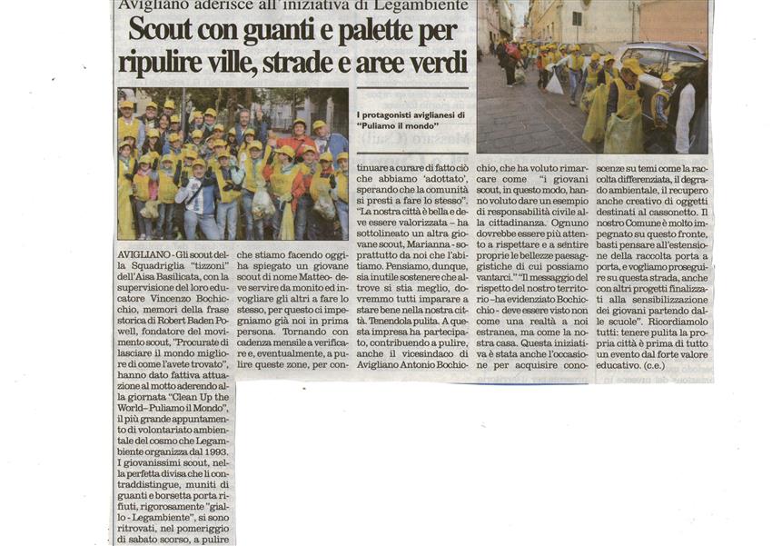 Avigliano. Gli scout della Squadriglia “tizzoni” dell’AISA Basilicata, con la supervisione del loro educatore Vincenzo Bochicchio, memori della frase storica di Robert Baden Powell, fondatore del movimento scout, "Procurate di lasciare il mondo migliore di come l'avete trovato", hanno dato fattiva attuazione al motto aderendo alla giornata “Clean Up the World– Puliamo il Mondo”, il più grande appuntamento di volontariato ambientale del cosmo che Legambiente organizza dal 1993. I giovanissimi scout, nella perfetta divisa che li contraddistingue, muniti di guanti e borsetta porta rifiuti, rigorosamente "giallo - Legambiente”, si sono ritrovati, nel pomeriggio di sabato scorso, a pulire le ville comunali, le strade principali e le aree verdi della nostra città. “Quello che stiamo facendo oggi- ha spiegato un giovane scout di nome Matteo- deve servire da monito ed invogliare gli altri a fare lo stesso, per questo ci impegniamo già noi in prima persona. Tornando con cadenza mensile a verificare e, eventualmente, a pulire queste zone, per continuare a curare di fatto ciò che abbiamo ‘adottato’, sperando che la comunità si presti a fare lo stesso.” “La nostra città è bella e deve essere valorizzata – ha sottolineato un altra giovane scout, Marianna - soprattutto da noi che l’abitiamo. Pensiamo, dunque, sia inutile sostenere che altrove si stia meglio, dovremmo tutti imparare a stare bene nella nostra città. Tenendola pulita. A questa impresa ha partecipato, contribuendo a pulire, anche il vicesindaco di Avigliano Antonio Bochicchio, che ha voluto rimarcare come “i giovani scout, in questo modo, hanno voluto dare un esempio di responsabilità civile alla cittadinanza. Ognuno dovrebbe essere più attento a rispettare e a sentire proprie le bellezze paesaggistiche di cui possiamo vantarci.” “Il messaggio del rispetto del nostro territorio –ha evidenziato Bochicchio - deve essere visto non come una realtà a noi estranea, ma come la nostra casa. Questa iniziativa è stata anche l'occasione per acquisire conoscenze su temi come la raccolta differenziata, il degrado ambientale, il recupero anche creativo di oggetti destinati al cassonetto. Il nostro Comune è molto impegnato su questo fronte, basti pensare all'estensione della raccolta porta a porta, e vogliamo proseguire su questa strada, anche con altri progetti finalizzati alla sensibilizzazione dei giovani partendo dalle scuole.” Ricordiamolo tutti: tenere pulita la propria città è prima di tutto un evento dal forte valore educativo, e l’iniziativa “Puliamo il Mondo” di Legambiente è di cura e di pulizia, un’azione allo stesso tempo concreta e simbolica per chiedere città più pulite e vivibili.