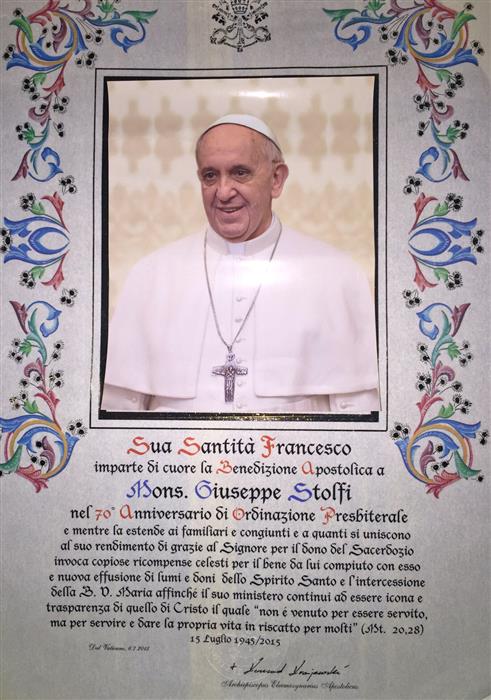 Era il 15 luglio 1945 quando il giovane don Peppino Stolfi, oggi 94enne, riceve l’ordinazione sacerdotale. Oggi, alla vigilia della Festa della Madonna del Carmine, Avigliano ricorda i 70 anni dalla sua ordinazione sacerdotale. «Settant’anni – dice don Mimmo Lorusso, responsabile pastorale di zona - è un traguardo importante, che non può non farci ringraziare il Signore per il dono dei suoi ministri e per il dono di don Peppino Stolfi». «Insieme a lui – continua - la comunità parrocchiale di Avigliano prima e quella di San Cataldo poi, hanno camminato quasi un secolo attraversando momenti difficili e lieti con una certezza e un modus vivendi che in don Peppino non sono mai venuti meno: “Tutto per la maggior gloria di Dio”». «Tutta la sua attività pastorale e la sua produzione letteraria sono state orientate da questo amore infinito per Dio e per l’uomo. La carità e lo sguardo di misericordia sono state l’essenza del suo operato. Il Signore ce lo ha donato come faro luminoso e non ha mai smesso di fare luce con l’umanità “divinizzata ”, come ama dire lui». «Lo vogliamo affidare a Maria Santissima, Vergine del Carmine, madre tenerissima e premurosa» – conclude don Mimmo Lorusso : come figlio devoto a lei». .