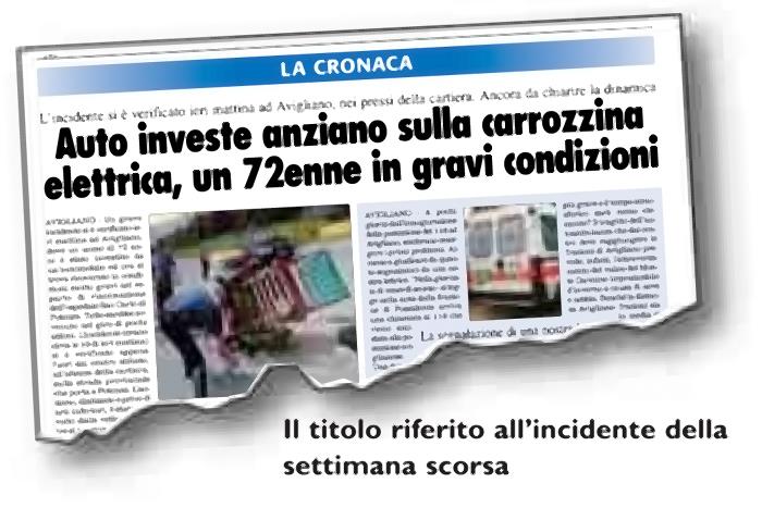 AUTO INVESTE ANZIANO SULLA CARROZZINA ELETTRICA, UN 72ENNE IN GRAVI CONDIZIONI L’incidente si è verificato ieri mattina ad Avigliano, nei pressi della cartiera. Ancora da chiarire la dinamica |