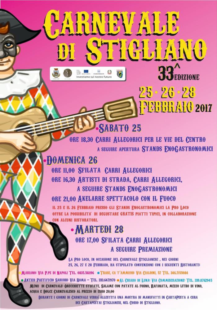 33 EDIZIONE DEL CARNEVALE DI STIGLIANO STIGLIANO(MT) DAL 25 AL 28 FEBBRAIO 2017 La Pro Loco di Stigliano con il patrocinio del Comune di Stigliano è lieta di presentare la “33^ edizione del Carnevale Stiglianese”. |