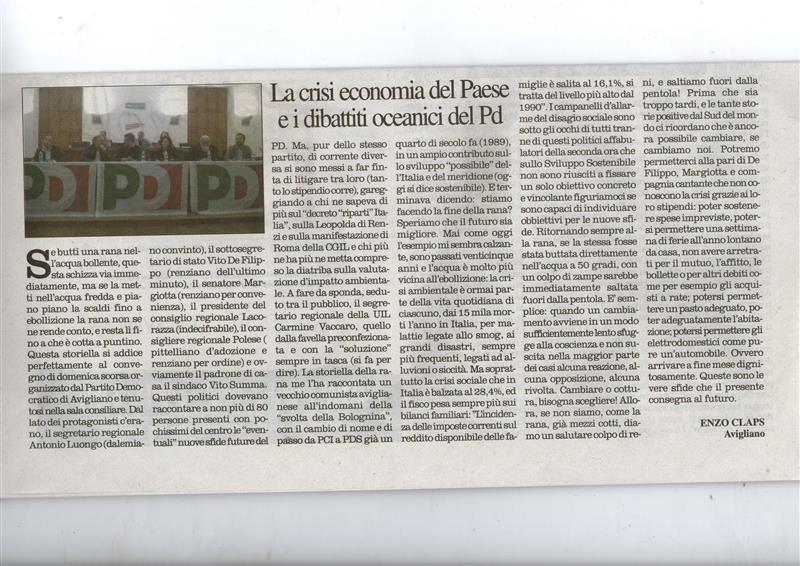 Se butti una rana nell'acqua bollente, questa schizza via immediatamente, ma se la metti nell'acqua fredda e piano piano la scaldi fino a ebollizione la rana non se ne rende conto, e resta lì fino a che è cotta a puntino. Questa storiella si addice perfettamente al convegno di domenica scorsa organizzato dal Partito Democratico di Avigliano e tenutosi nella sala consiliare. Dal lato dei protagonisti c’erano, il segretario regionale Antonio Luongo (dalemiano convinto), il sottosegretario di stato Vito De Filippo (renziano dell’ultimo minuto), il senatore Margiotta (renziano per convenienza), il presidente del consiglio regionale Lacorazza (indecifrabile), il consigliere regionale Polese ( pittelliano d’adozione e renziano per ordine) e ovviamente il padrone di casa il sindaco Vito Summa. Questi politici dovevano raccontare a non più di 80 persone presenti con pochissimi del centro le “eventuali” nuove sfide future del PD. Ma, pur dello stesso partito, di corrente diversa si sono messi a far finta di litigare tra loro (tanto lo stipendio corre), gareggiando a chi ne sapeva di più sul “decreto “riparti” Italia”, sulla Leopolda di Renzi e sulla manifestazione di Roma della CGIL e chi più ne ha più ne metta compreso la diatriba sulla valutazione d’impatto ambientale. A fare da sponda, seduto tra il pubblico, il segretario regionale della UIL Carmine Vaccaro, quello dalla favella preconfezionata e con la “soluzione” sempre in tasca (si fa per dire). La storiella della rana me l’ha raccontata un vecchio comunista aviglianese all’indomani della “svolta della Bolognina”, con il cambio di nome e di passo da PCI a PDS già un quarto di secolo fa (1989), in un ampio contributo sullo sviluppo “possibile” dell’Italia e del meridione (oggi si dice sostenibile). E terminava dicendo: stiamo facendo la fine della rana? Speriamo che il futuro sia migliore. Mai come oggi l'esempio mi sembra calzante, sono passati venticinque anni e l'acqua è molto più vicina all'ebollizione: la crisi ambientale è ormai parte della vita quotidiana di ciascuno, dai 15 mila morti l'anno in Italia, per malattie legate allo smog, ai grandi disastri, sempre più frequenti, legati ad alluvioni o siccità. Ma soprattutto la crisi sociale che in Italia è balzata al 28,4%, ed il fisco pesa sempre più sui bilanci familiari: 'L'incidenza delle imposte correnti sul reddito disponibile delle famiglie è salita al 16,1%, si tratta del livello più alto dal 1990". I campanelli d’allarme del disagio sociale sono sotto gli occhi di tutti tranne di questi politici affabulatori della seconda ora che sullo Sviluppo Sostenibile non sono riusciti a fissare un solo obiettivo concreto e vincolante figuriamoci se sono capaci di individuare obbiettivi per le nuove sfide. Ritornando sempre alla rana, se la stessa fosse stata buttata direttamente nell’acqua a 50 gradi, con un colpo di zampe sarebbe immediatamente saltata fuori dalla pentola. E’ semplice: quando un cambiamento avviene in un modo sufficientemente lento sfugge alla coscienza e non suscita nella maggior parte dei casi alcuna reazione, alcuna opposizione, alcuna rivolta. Cambiare o cottura, bisogna scegliere! Allora, se non siamo, come la rana, già mezzi cotti, diamo un salutare colpo di reni, e saltiamo fuori dalla pentola! Prima che sia troppo tardi, e le tante storie positive dal Sud del mondo ci ricordano che è ancora possibile cambiare, se cambiamo noi. Potremo permetterci alla pari di De Filippo, Margiotta e compagnia cantante che non conoscono la crisi grazie ai loro stipendi: poter sostenere spese impreviste, potersi permettere una settimana di ferie all’anno lontano da casa, non avere arretrati per il mutuo, l’affitto, le bollette o per altri debiti come per esempio gli acquisti a rate; potersi permettere un pasto adeguato, poter adeguatamente l’abitazione; potersi permettere gli elettrodomestici come pure un’automobile. Ovvero arrivare a fine mese dignitosamente. Queste sono le vere sfide che il presente consegna al futuro.
