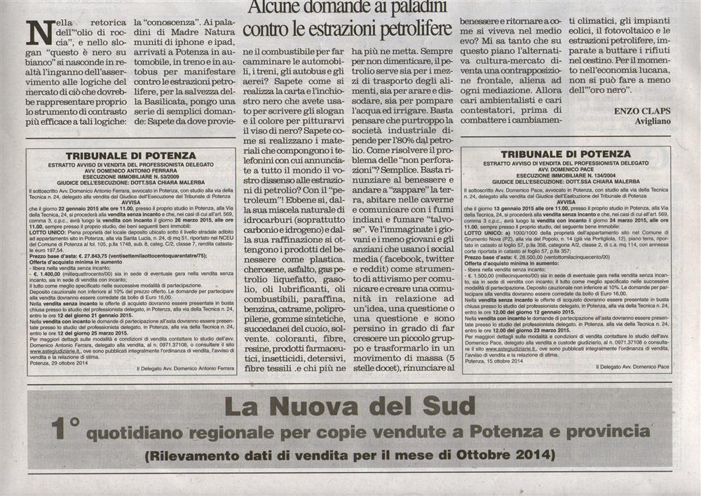 Nella retorica dell’“olio di roccia”, e nello slogan “questo è nero su bianco” si nasconde in realtà l’inganno dell’asservimento alle logiche del mercato di ciò che dovrebbe rappresentare proprio lo strumento di contrasto più efficace a tali logiche: la “conoscenza”. Ai paladini di Madre Natura muniti di iphone e ipad, arrivati a Potenza in automobile, in treno e in autobus per manifestare contro le estrazioni petrolifere, per la salvezza della Basilicata, pongo una serie di semplici domande: Sapete da dove proviene il combustibile per far camminare le automobili, i treni, gli autobus e gli aerei? Sapete come si realizza la carta e l’inchiostro nero che avete usato per scrivere gli slogan e il colore per pitturarvi il viso di nero? Sapete come si realizzano i materiali che compongono i telefonini con cui annunciate a tutto il mondo il vostro dissenso alle estrazioni di petrolio? Con il “petroleum”! Ebbene si, dalla sua miscela naturale di idrocarburi (soprattutto carbonio e idrogeno) e dalla sua raffinazione si ottengono i prodotti del benessere come plastica. cherosene, asfalto, gas petrolio liquefatto, gasolio, oli lubrificanti, oli combustibili, paraffina, benzina, catrame, polipropilene, gomme sintetiche, succedanei del cuoio, solvente. coloranti, fibre, resine, prodotti farmaceutici, insetticidi, detersivi, fibre tessili .e chi più ne ha più ne metta. Sempre per non dimenticare, il petrolio serve sia per i mezzi di trasporto degli alimenti, sia per arare e dissodare, sia per pompare l’acqua ed irrigare. Basta pensare che purtroppo la società industriale dipende per l'80% dal petrolio. Come risolvere il problema delle “non perforazioni”? Semplice. Basta rinunziare al benessere e andare a “zappare” la terra, abitare nelle caverne e comunicare con i fumi indiani e fumare “talvose”. Ve l’immaginate i giovani e i meno giovani e gli anziani che usano i social media (facebook, twitter e reddit) come strumento di attivismo per comunicare e creare una comunità in relazione ad un’idea, una questione e sono persino in grado di far crescere un piccolo gruppo e trasformarlo in un movimento di massa (5 stelle docet), rinunciare al benessere e ritornare a come si viveva nel medio evo? Mi sa tanto che su questo piano l’alternativa cultura-mercato diventa una contrapposizione frontale, aliena ad ogni mediazione. Allora cari ambientalisti e cari contestatori, prima di combattere i cambiamenti climatici, gli impianti eolici, il fotovoltaico e le estrazioni petrolifere, imparate a buttare i rifiuti nel cestino. Per il momento nell’economia lucana, non si può fare a meno dell’"oro nero".