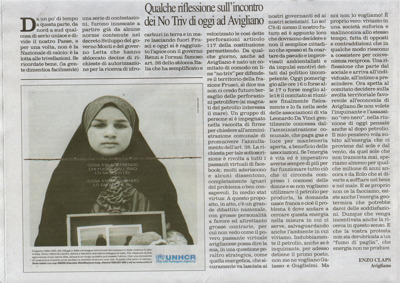 Avigliano – “NoTriv”- Da un po’ di tempo a questa parte, da nord a sud qualcosa di serio unisce e divide il nostro Paese, e per una volta, non è la Nazionale di calcio: è la lotta alle trivellazioni. Se ricordate bene, (la gente dimentica facilmente) una serie di contestazioni, furono innescate a partire già da alcune norme contenute nel decreto Sviluppo del governo Monti e del governo Letta che hanno sbloccato decine di richieste di autorizzazione per la ricerca di idrocarburi in terra e in mare lasciando fuori Frusci e oggi si è raggiunto l’apice con il governo Renzi e l’ormai famoso art. 38 dello sblocca Italia che ha semplificato e velocizzato le cosi dette perforazioni articolo 117 della costituzione permettendo. Da qualche giorno, anche ad Avigliano è nato un comitato di comodo on line “no triv” per difendere il territorio della frazione Frusci, si dice ma non ci credo futuro bersaglio delle perforazioni petrolifere (ai magnati del petrolio interessa il mare). Un gruppo di persone si è impegnato nella raccolta di firme per chiedere all’amministrazione comunale di promuovere l’annullamento dell’art. 38. La richiesta per tale sottoscrizione è rivolta a tutti i passanti virtuali di facebook: molti aderiscono e alcuni dissentono, completamente ignari del problema o ben consapevoli. In medio stat virtus: A questo proposito, in atto, c'è un grande dibattito nazionale, con grosse personalità a favore ed altrettanto grosse contrarie, per cui non vedo come il povero passante virtuale aviglianese possa dire la sua, in una questione peraltro strategica, come quella energetica, che sicuramente va lasciata ai nostri governanti ed ai nostri scienziati. Lo so! C'è di mezzo il nostro futuro ed è appunto loro che dovranno decidere e non il semplice cittadino che spesso si fa coartare da pseudo e improvvisati ambientalisti e da impulsi emotivi dettati dal politico incompetente. Domani pomeriggio alle ore 16 o forse alle 17 o forse meglio alle18 il comitato si riunisce finalmente fisicamente e lo fa nella sede delle associazioni di via Leonardo Da Vinci gentilmente concessa dall’amministrazione comunale, che paga gas e luce per mantenerla aperta, a beneficio delle associazioni. Se l'energia è vita ed è imperativo averne sempre di più per far funzionare tutto ciò che ci circonda compreso i cosmesi delle donne e se non vogliamo utilizzare il petrolio per produrla, la domanda nasce franca e cioè il problema è dove andare a cercare questa energia nella misura in cui ci serve, salvaguardando anche l'ambiente in cui viviamo. Indubbiamente il petrolio, anche se è inquinante, per adesso detiene il primo posto, non me ne vogliano Galasso e Guglielmi. Ma noi non lo vogliamo! È proprio vero: viviamo in una società euforica e malinconica allo stesso tempo, fatta di opposti e contraddizioni che in qualche modo riescono a coesistere per convenienza reciproca. Una riflessione che parte dal sociale e arriva all’individuale, all’intimo a prescindere. Ora spetta al comitato decidere sulla svolta territoriale favorevole all'economia di Avigliano.Se non volete l’inquinante e l’assassino “oro nero”, nella riunione di domani pensate anche al dopo petrolio. Il mio pensiero vola subito all'energia che ci proviene dal sole e dal vento, da quel sole che non tramonta mai, speriamo almeno per qualche milione di anni ancora e da Eolo che si diverte a soffiare nel bene e nel male. E se proprio non ce la facciamo, esiste anche l'energia geotermica che potrebbe darci delle soddisfazioni. Dunque che venga incentivata anche la ricerca in questo senso. E che la vostra protesta non sia derubricata a un “fumo di paglia”, che energia non ne produce.