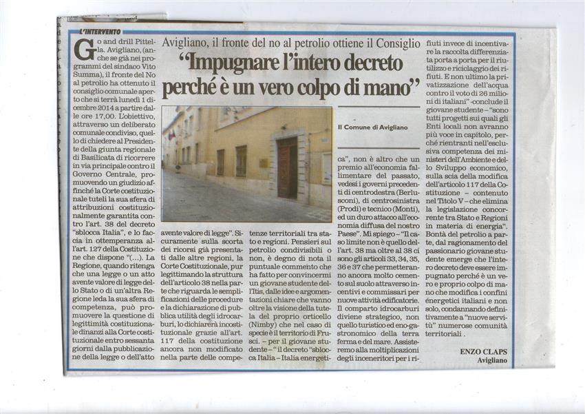 Go and drill Pittella. Avigliano, (anche se già nei programmi del sindaco Vito Summa), il fronte del No al petrolio ha ottenuto il consiglio comunale aperto che si terrà lunedì 1 dicembre 2014 a partire dalle ore 17,00. L’obiettivo, attraverso un deliberato comunale condiviso, quello di chiedere al Presidente della giunta regionale di Basilicata di ricorrere in via principale contro il Governo Centrale, promuovendo un giudizio affinché la Corte costituzionale tuteli la sua sfera di attribuzioni costituzionalmente garantita contro l’art. 38 del decreto “sblocca Italia”, e lo faccia in ottemperanza all’art. 127 della Costituzione che dispone “(…). La Regione, quando ritenga che una legge o un atto avente valore di legge dello Stato o di un'altra Regione leda la sua sfera di competenza, può promuovere la questione di legittimità costituzionale dinanzi alla Corte costituzionale entro sessanta giorni dalla pubblicazione della legge o dell'atto avente valore di legge”. Sicuramente sulla scorta dei ricorsi già presentati dalle altre regioni, la Corte Costituzionale, pur legittimando la struttura dell’articolo 38 nella parte che riguarda le semplificazioni delle procedure e la dichiarazione di pubblica utilità degli idrocarburi, lo dichiarerà incostituzionale grazie all’art. 117 della costituzione ancora non modificato nella parte delle competenze territoriali tra stato e regioni. Pensieri sul petrolio condivisibili o non, è degno di nota il puntuale commento che ha fatto per convincermi un giovane studente dell’ITIS, dalle Idee e argomentazioni chiare che vanno oltre la visione della tutela del proprio orticello (NIMBY) che nel caso di specie è il territorio di Frusci. – per il giovane studente – “ il decreto “sbocca Italia – Italia energetica”, non è altro che un premio all’economia fallimentare del passato, vedesi i governi precedenti di centrodestra (Berlusconi), di centrosinistra (Prodi) e tecnico (Monti), ed un duro attacco all’economia diffusa del nostro Paese”. Mi spiego – “Il caso limite non è quello dell'Art.38 ma oltre al 38 ci sono gli articoli 33, 34, 35, 36 e 37 che permetteranno ancora molto cemento sul suolo attraverso incentivi e commissari per nuove attività edificatorie. Il comparto idrocarburi diviene strategico, non quello turistico ed eno-gastronomico della terra ferma e del mare. Assisteremo alla moltiplicazioni degli inceneritori per i rifiuti invece di incentivare la raccolta differenziata porta a porta per il riutilizzo e riciclaggio dei rifiuti. E non ultimo la privatizzazione dell'acqua contro il voto di 26 milioni di italiani.”. conclude il giovane studente – “sono tutti progetti sui quali gli Enti locali non avranno più voce in capitolo, perché rientranti nell’esclusiva competenza dei ministeri dell’Ambiente e dello Sviluppo economico, sulla scia della modifica dell’articolo 117 della Costituzione – contenuto nel Titolo V – che elimina la legislazione concorrente tra Stato e Regioni in materia di energia.“. Bontà del petrolio a parte, dal ragionamento del passionario giovane studente emerge che l’intero decreto deve essere impugnato perché è un vero e proprio colpo di mano che modifica i confini energetici italiani e non solo, condannando definitivamente a “nuove servitù” numerose comunità territoriali .