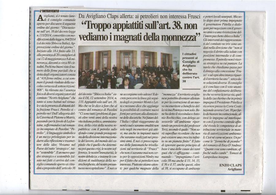 Avigliano 1° dicembre si è tenuto il consiglio comunale aperto per discutere il seguente ordine del giorno: “Discussione sull’art. 38 del decreto legge n. 133/2014, convertito con modificazioni dalla legge n. 164/2014 (cd decreto Sblocca Italia). Approvazione ordine del giorno.”, iniziato alle ore 18,00 finito alle ore 23,00 consiglieri presenti 20 su 21 di cui 12 maggioranza e 8 delle minoranza, cittadini presenti circa 80 pochi ma buoni visto il numero delle firme di sottoscrizione parziale che a detta degli organizzatori costa di “416 firme online, a cui sommare il grande risultato della raccolta cartacea di sottoscrizioni: 908.”. Va rilevata sia l’assenza fisica di diversi organizzatori del comitato “No triv Avigliano” che tanto si sono battuti nel virtuale e sia della presenza di cittadini abitanti della frazione Frusci. Petrolio si – petrolio no! Dall’allegoria della Caverna di Platone a Matrix, passando per le favole di La fontaine, soffermandoci sul romanzo incompiuto di Pasolini “Petrolio”, il linguaggio simbolico è un mezzo privilegiato per indurre alla riflessione e trasmettere delle idee. Viviamo nel Paese del tutto 'strategico', tutto “sostenibile”. E un nuovo quadro strategico e sostenibile falsato nei fatti ci arriva dal consiglio comunale aperto ai cittadini a proposito dell’articolo 38 del decreto “Sblocca Italia” ossia il DL 12 settembre 2014, n. 133 recante "Misure urgenti per l'apertura dei cantieri, la realizzazione delle opere pubbliche, la digitalizzazione del Paese, la semplificazione burocratica, l'emergenza del dissesto idrogeologico e per la ripresa delle attività produttive". Appiattiti solo sull’art. 38. Ma che ve lo dico a fare che al centro del romanzo di Pasolini “Ci sono tutti i problemi di questi oltre venti anni della nostra vita italiana politica, amministrativa, della crisi della nostra repubblica: con il petrolio sullo sfondo come grande protagonista della divisione internazionale del lavoro, del mondo del capitale che è quello che determina poi questa crisi, le nostre sofferenze, le nostre immaturità, le nostre debolezze, e insieme le condizioni di sudditanza della nostra borghesia, del nostro presuntuoso neocapitalismo”. E noi ce ne accorgiamo solo adesso! Il decreto percorre la linea già seguita dagli ex premier Monti e Letta e nessuno dice che aggiunge la possibilità di costruire nuovi forni per arrivare alla dismissione delle discariche. Nel futuro dell’Italia i rifiuti viaggeranno da nord a sud e saranno smaltiti non solo negli inceneritori già attivi, ma anche in impianti nuovi che saranno realizzati nei prossimi anni. E noi ci preoccupiamo delle fantomatiche trivellazioni sul territorio di “Frusci” che non ci saranno mai non certo per le opposizioni NIMBY ma per il fatto che ai petrolieri non interessa. Piuttosto stiamoci attenti per qualche magnate della “monnezza” il territorio aviglianese potrebbe diventare allettante per la costruzione di un nuovo inceneritore a beneficio della vicina Potenza e non solo. Bene ha detto il vicesindaco Antonio Bochicchio, con delega assessorile all’ambiente riportando un pensiero del professor Terzi, secondo il quale: “non sarà superfluo ricordare che non può esistere una crescita infinita su un pianeta finito” Il fatto di ignorare questo principio di base è una delle cause dei tanti guai che ci affliggono – continuando – “impugniamo l’articolo 38 ma anche il 33, 34, 35, il 36 e il 37, anche questi, oltre al 38, si occupano di ambiente e poteri locali usurpati. Ma solo dopo aver prima impegnato il governatore Pittella a dialogare per negoziare con il governo amico a una rivisitazione dell’intero pacchetto sblocca Italia.”. Gli interventi dei rappresentanti del comitato non triv sono andati nella direzione che “non si negozia il diritto alla salute con posizioni intermedie o di compromesso. Il petrolio non è risorsa strategica su cui puntare. La tutela che chiediamo passa per il diniego alla concessione 'Frusci' e ad ogni altra istanza riguardi il territorio lucano”, senza dare soluzioni diverse. Il consiglio si è concluso con il voto unanime del confusionario deliberato che va in direzione della terza via, ovvero quella dello zuccherino che in primis impegna il Presidente Pittella a ricorrere presso la Corte Costituzionale avverso l’art. 38 per farlo dichiarare incostituzionale, altresì impegna il presidente Pittella ad interloquire con il governo centrale affinché riveda le competenze di attribuzione territoriale in materia di autorizzazioni ambientali. Mi sa tanto che non è ne carne e ne pesce. In conclusione se dovessi paragonare il comportamento dei cittadini e dei consiglieri lo accomunerei alle “formiche di piombo” descritte nel romanzo di Enzo D’Andrea, autore compreso da cui prendo in prestito una citazione famosa da lui modificata ed usata sulla copertina del romanzo: “quante cose sono cambiate, affinché nulla cambi”. Tomasi di Lampedusa insegna.
