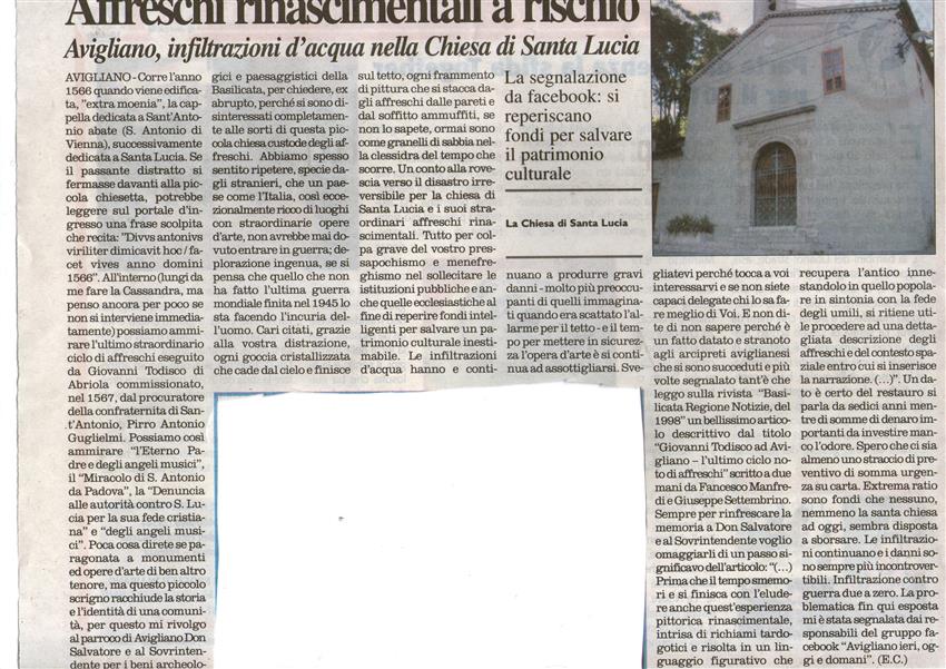 Avigliano, corre l’anno 1566 quando viene edificata, "extra moenia", la cappella dedicata a Sant’Antonio abate (S. Antonio di Vienna), successivamente dedicata a Santa Lucia. Se il passante distratto si fermasse davanti alla piccola chiesetta, potrebbe leggere sul portale d'ingresso una frase scolpita che recita: "DIVVS ANTONIVS VIRILITER DIMICAVIT HOC / FACET VIVES ANNO DOMINI 1566". All’interno (lungi da me fare la Cassandra, ma penso ancora per poco se non si interviene immediatamente) possiamo ammirare l'ultimo straordinario ciclo di affreschi eseguito da Giovanni Todisco di Abriola commissionato, nel 1567, dal procuratore della confraternita di Sant’Antonio, Pirro Antonio Guglielmi. Possiamo così ammirare “l’Eterno Padre e degli angeli musici”, il “Miracolo di S. Antonio da Padova”, la “Denuncia alle autorità contro S. Lucia per la sua fede cristiana” e “degli angeli musici”. Poca cosa direte se paragonata a monumenti ed opere d’arte di ben altro tenore, ma questo piccolo scrigno racchiude la storia e l’identità di una comunità, per questo mi rivolgo al parroco di Avigliano Don Salvatore e al Sovrintendente per i beni archeologici e paesaggistici della Basilicata, per chiedere, ex abrupto, perché si sono disinteressati completamente alle sorti di questa piccola chiesa custode degli affreschi. Abbiamo spesso sentito ripetere, specie dagli stranieri, che un paese come l’Italia, così eccezionalmente ricco di luoghi con straordinarie opere d'arte, non avrebbe mai dovuto entrare in guerra; deplorazione ingenua, se si pensa che quello che non ha fatto l’ultima guerra mondiale finita nel 1945 lo sta facendo l’incuria dell’uomo. Cari citati, grazie alla vostra distrazione, ogni goccia cristallizzata che cade dal cielo e finisce sul tetto, ogni frammento di pittura che si stacca dagli affreschi dalle pareti e dal soffitto ammuffiti, se non lo sapete, ormai sono come granelli di sabbia nella clessidra del tempo che scorre. Un conto alla rovescia verso il disastro irreversibile per la chiesa di Santa Lucia e i suoi straordinari affreschi rinascimentali. Tutto per colpa grave del vostro pressapochismo e menefreghismo nel sollecitare le istituzioni pubbliche e anche quelle ecclesiastiche al fine di reperire fondi intelligenti per salvare un patrimonio culturale inestimabile. E vi sembra poco? Le infiltrazioni d’acqua hanno e continuano a produrre gravi danni - molto più preoccupanti di quelli immaginati quando era scattato l’allarme per il tetto - e il tempo per mettere in sicurezza l’opera d’arte è si continua ad assottigliarsi. Svegliatevi perché tocca a voi interessarvi e se non siete capaci delegate chi lo sa fare meglio di Voi. E non dite di non sapere perché è un fatto datato e stranoto agli arcipreti aviglianesi che si sono succeduti e più volte segnalato tant’è che leggo sulla rivista "Basilicata Regione Notizie, del 1998” un bellissimo articolo descrittivo dal titolo “Giovanni Todisco ad Avigliano – l’ultimo ciclo noto di affreschi” scritto a due mani da Fancesco Manfredi e Giuseppe Settembrino. Sempre per rinfrescare la memoria a Don Salvatore e al Sovrintendente voglio omaggiarli di un passo significavo dell’articolo: “(…) Prima che il tempo smemori e si finisca con l'eludere anche quest'esperienza pittorica rinascimentale, intrisa di richiami tardo-gotici e risolta in un linguaggio figurativo che recupera l'antico innestandolo in quello popolare in sintonia con la fede degli umili, si ritiene utile procedere ad una dettagliata descrizione degli affreschi e del contesto spaziale entro cui si inserisce la narrazione. (…)”. Un dato è certo del restauro si parla da sedici anni mentre di somme di denaro importanti da investire manco l’odore. Spero che ci sia almeno uno straccio di preventivo di somma urgenza su carta. Extrema ratio sono fondi che nessuno, nemmeno la santa chiesa ad oggi, sembra disposta a sborsare. Le infiltrazioni continuano e i danni sono sempre più incontrovertibili. Infiltrazione contro guerra due a zero. La problematica fin qui esposta mi è stata segnalata dai responsabili del gruppo facebook “Avigliano ieri, oggi e domani” che racconta la nostra cittadina attraverso le fotografie di ieri, di oggi, aspettando domani.