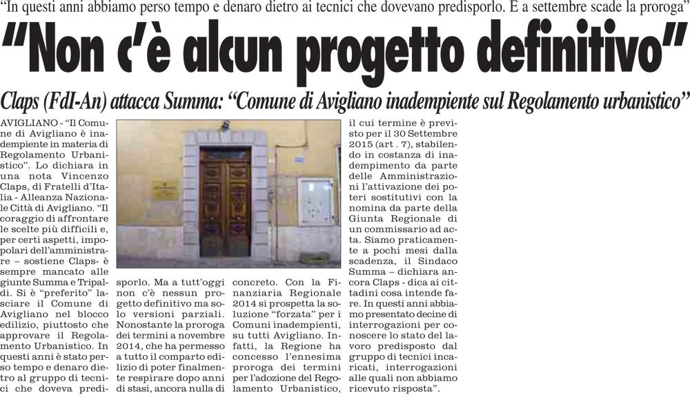 AVIGLIANO - “Il Comune di Avigliano è inadempiente in materia di Regolamento Urbanistico”. Lo dichiara in una nota Vincenzo Claps, di Fratelli d’Italia - Alleanza Nazionale Città di Avigliano. “Il coraggio di affrontare le scelte più difficili e, per certi aspetti, impopolari dell’amministrare – sostiene Claps- è sempre mancato alle giunte Summa e Tripaldi. Si è “preferito” lasciare il Comune di Avigliano nel blocco edilizio, piuttosto che approvare il Regolamento Urbanistico. In questi anni è stato perso tempo e denaro dietro al gruppo di tecnici che doveva predisporlo. Ma a tutt’oggi non c’è nessun progetto definitivo ma solo versioni parziali. Nonostante la proroga dei termini a novembre 2014, che ha permesso a tutto il comparto edilizio di poter finalmente respirare dopo anni di stasi, ancora nulla di concreto. Con la Finanziaria Regionale 2014 si prospetta la soluzione “forzata” per i Comuni inadempienti, su tutti Avigliano. Infatti, la Regione ha concesso l’ennesima proroga dei termini per l’adozione del Regolamento Urbanistico, il cui termine è previsto per il 30 Settembre 2015 (art . 7), stabilendo in costanza di inadempimento da parte delle Amministrazioni l’attivazione dei poteri sostitutivi con la nomina da parte della Giunta Regionale di un commissario ad acta. Siamo praticamente a pochi mesi dalla scadenza, il Sindaco Summa – dichiara ancora Claps - dica ai cittadini cosa intende fare. In questi anni abbiamo presentato decine di interrogazioni per conoscere lo stato del lavoro predisposto dal gruppo di tecnici incaricati, interrogazioni alle quali non abbiamo ricevuto risposta”.