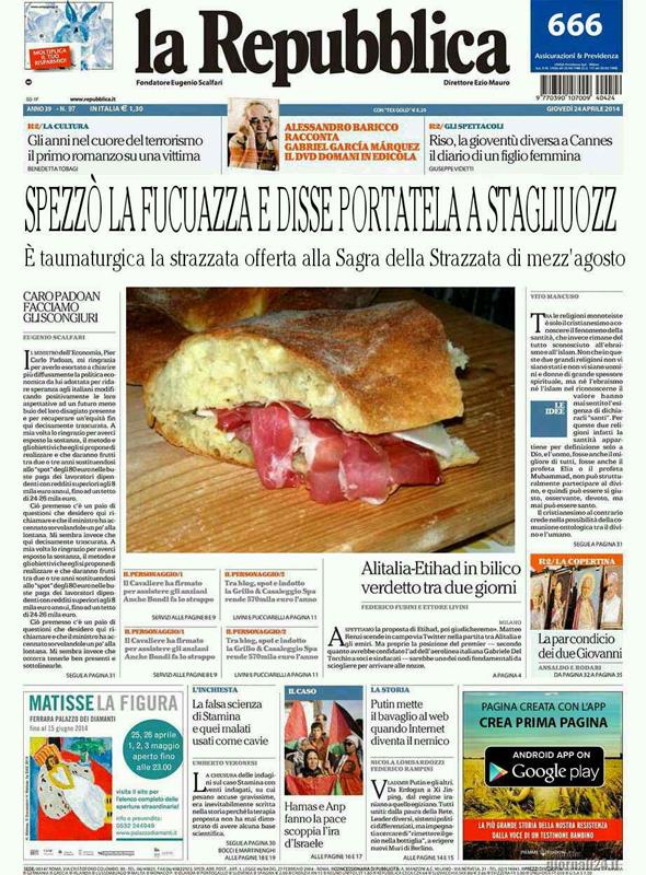 Gesù prese il pane lo spezzo e disse: prendete e mangiatene tutti… poi prese la fucuazza la spezzò e disse portatela a Stagliuozz. E Salvini ubbidì. Avigliano: un modo diverso di scoprire culture, sapori e tradizioni, voglia di stare insieme, condividere emozioni comune con la sagra della strazzata che si celebra a Stagliuozzo il 20 agosto. Da 18 anni l’incontro annuale alla riscoperta di antichi e moderni sapori da mordere sotto i denti ed assaporare. Una sagra anticrisi, una festa di frazione come tante ce ne sono, specie nel periodo estivo, ma la vera notizia è che il caso è approdato al nord in casa Salvini dove udite, udite, l’elettrice della lega prepara al figlio solo strazzate aviglianesi imbottite con prosciutto e provolone, per non farsi rubare i panini dai figli dei musulmani. I partecipanti potranno assaggiare strazzate sfiziose di ogni genere, e vino a volontà, il tutto sulle note di una buona musica da intrattenimento e così le famiglie potranno affrontare i morsi della recessione a poco prezzo. Per non dimenticare: Siamo negli anni '50, 60 e 70, i matrimoni venivano celebrati di giorno feriale e quasi sempre d'inverno, quando il lavoro nei campi concedeva una lunga tregua. Una cerimonia molto semplice e sobria che si concludeva con la “spnziata re la zita” il primo giro era la famosa strazzata con il pepe e farcito con una fetta di prosciutto e una di provolone. Tempi duri ma belli. Ricordiamo anche che l’evento con tutte le sue peculiarità è organizzato dall’associazione il Cigno con il patrocinio del Comune di Avigliano e la regia dell’assessore “nordico” alla valorizzazione del territorio Vito Lucia. Proviamo ad immaginare ora la realtà di un tempo passato nel medesimo posto. La processione dei visitatori nella sagra di Stagliuozzo oggi è realtà.