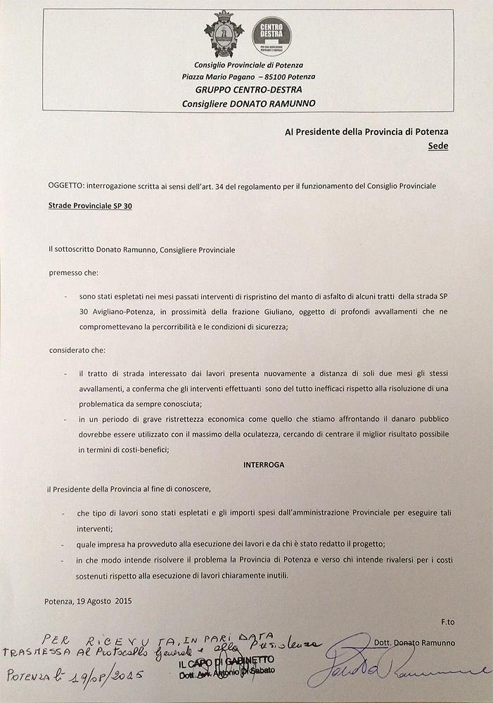Nostro malgrado, siamo costretti ancora una volta ad interessarci dei lavori di ripristino delle condizioni di percorribilità della strada provinciale Sp 30 Potenza-Avigliano. A distanza di soli due mesi dai lavori di rifacimento del manto stradale eseguiti dalla Provincia di Potenza, si sono ripresentati i soliti avvallamenti. Visto l’immobilismo dell’Amministrazione comunale di Avigliano, a tutela dei Lucani che percorrono questa strada e che vedono, da anni, sperperate risorse pubbliche per interventi tampone che non risolvono i problemi della viabilità, abbiamo presentato un’interrogazione al Presidente della Provincia di Potenza per chiedere la natura degli interventi che sono stati effettuati, gli importi spesi dall’amministrazione Provinciale per eseguire tali interventi, quale impresa ha provveduto alla esecuzione dei lavori e da chi è stato redatto il progetto, ma soprattutto in che modo intende risolvere il problema la Provincia di Potenza e verso chi intende rivalersi per i costi sostenuti rispetto alla esecuzione di lavori chiaramente inutili. Infatti nei mesi passati, in un tratto della strada in prossimità di contrada Giuliano, la Provincia di Potenza ha provveduto ad eseguire il rifacimento del manto di asfalto fortemente segnato da profondi avvallamenti. Oggi, il tratto di strada interessato dai lavori presenta nuovamente gli stessi avvallamenti, a conferma che gli interventi effettuanti sono del tutto inefficaci rispetto alla risoluzione di una problematica conosciuta da sempre. Questa è la prova provata a conferma di quanto sostenevano in relazione agli ultimi interventi eseguiti su tutta l’arteria stradale che collega Potenza con Avigliano e cioè che in assenza di opere strutturali rivolte al consolidamento dei versanti attraversati dalla strada e opere di drenaggio e regimentazione delle acque endogene ed esogene, i lavori risulteranno una soluzione del tutto approssimativa e temporanea, che comporterà soprattutto uno sperpero delle già scarse risorse finanziere a disposizione dell’amministrazione provinciale. In un periodo di grave ristrettezza economica, come quello che stiamo affrontando, il danaro pubblico dovrebbe essere utilizzato con il massimo dell’oculatezza, cercando di centrare il miglior risultato possibile in termini di costi-benefici, cosa, che nel caso specifico, ci risulta non essere assolutamente stato neppure sfiorato, il tutto nel silenzio dell’Amministrazione aviglianese.