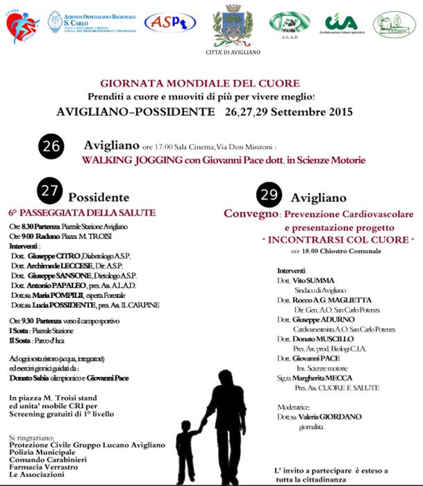 Previste ad Avigliano tre giornate di sensibilizzazione sulla prevenzione delle malattie cardiovascolari organizzate dalle Associazioni “Cuore e Salute” e “Il Carpine”, in rete con il Comune di Avigliano, ASP, ALAD – FAND, CRI e CIA, per aderire alle iniziative promosse in occasione della Giornata Mondiale per il cuore del 29 settembre, un evento globale con l’obiettivo “25 By 25” di ridurre le malattie cardiovascolari del 25% entro il 2025. Oggi, alle ore 17.00, presso la Sala Cinema comunale di Avigliano si terrà una Lezione teorica sul walking – jogging a cura di Giovanni Pace, esperto in scienze motorie, mentre domenica 27 è prevista la 6° Passeggiata della Salute in località Possidente, con raduno alle 8,30 in piazza Troisi. Saranno presenti stand con materiale informativo e un’unità mobile CRI per eseguire screening di I livello. Guideranno la passeggiata i medici Giuseppe Citro, Endocrinologo e Diabetologo, Archimede Leccese, Cardiologo e dirigente ASP, Giuseppe Sansone, Dietologo dell'Unità Operativa Igiene Alimenti e Nutrizione, Maria Pompilii, esperta forestale, gli istruttori Donato Sabia, campione olimpionico e Giovanni Pace. La passeggiata, che si svolgerà con il supporto dei Vigili Urbani di Avigliano, dei volontari della Protezione civile e di quelli delle Associazioni organizzatrici, prevede un percorso di circa 5 Km durante il quale sono previste due soste con ristoro ed esercizi ginnici. L’attività di divulgazione proseguirà martedì presso il Chiostro Comunale di Avigliano con un convegno in cui si discuterà di prevenzione cardiovascolare e verrà presentato il progetto “Incontrarsi col cuore”. Al dibattito interverranno il sindaco di Avigliano, Vito Summa, il Direttore Generale dell’Azienda Ospedaliera San Carlo di Potenza, Rocco Maglietta, Giuseppe Adurno, cardioanestesista dell’Ospedale San Carlo di Potenza, Donato Muscillo, presidente dell’Associazione produttori biologici della Confederazione Italiana Agricoltori, Giovanni Pace, esperto in scienze motorie. In questa occasione la pediatra Maristella D'Addezio e la Presidente dell’Associazione Cuore e Salute, Margherita Mecca, illustreranno nel dettaglio il progetto “Incontrarsi col cuore” destinato a circa 200 utenti con screening nelle scuole su ragazzi di età compresa tra i 6 e i 18 anni. Tali appuntamenti rientrano in un percorso di prevenzione che dal 2011 si sta svolgendo sul territorio aviglianese al fine di stimolare i cittadini a mantenere uno stile di vita più sano, ma anche sollecitare le Istituzioni a creare e manutenere aree verdi, marciapiedi e piste ciclabili, nonchè attivare adeguate politiche sanitarie per cooperare al raggiungimento dell’obiettivo generale “25by25”.