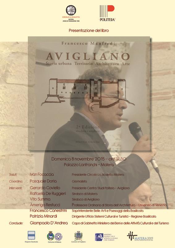 La città dei Sassi, domenica 8 novembre alle ore 17,30 nel famoso palazzo Lanfranchi, icona del seicento materano, ospiterà la presentazione della II edizione riveduta ed ampliata del libro – “Avigliano Storia Urbana territorio architettura arte” dello storico aviglianese Franz Manfredi ed edito da Politea. Oramai è storia risaputa che Matera sarà la Capitale europea della Cultura per il 2019, e quindi oltre a proporsi come veicolo di promozione e di sviluppo della sue tradizioni e della sua cultura si farà sicuramente promotrice anche dell’intero territorio lucano, unanimemente riconosciuto come “bellezza naturale” dal fascino intramontabile. Ed è certo che il territorio lucano è veramente sorprendente per gli innumerevoli itinerari che possono essere percorsi nella cornice di incantevoli paesaggi alcuni ancora inesplorati. Il libro di Franz, con l’immenso lavoro di ricostruzione storica ci riporta nell’atmosfera del passato della città di Avigliano e il richiamo alle opere letterarie ed artistiche avvolgono l'intera città in un manto di arte e di cultura europeista. In Luce Perfetta, Manfredi, non racconta solo una saga ambientale, ma permette al lettore di conoscere ed immergersi nel periodo storico nel quale si muovono e crescono i suoi personaggi, permette di avvicinarsi ad una terra che per molti è ancora tutta da scoprire, ma guarda con fiducia all’Europa, perché Matera protagonista della cultura, ad un tratto, si rifugia tra i territori lucani e si apre ad essi come nel racconto romanzato delle vicissitudini di un territorio sociale che però ha con radici comuni. Questo lo sanno bene gli organizzatori dell’evento: da una parte il “circolo la scaletta” di Matera, una delle associazioni storiche nel panorama lucano che opera da 56 anni ed è protagonista dei traguardi materani come il riconoscimento di Matera quale patrimonio dell’umanità tutelato dall’UNESCO fino alla sua nomina a Capitale Europea della Cultura per l’anno 2019, dall’altra parte l’associazione ed editore “Politea” di Avigliano, che diffondere la storia di Avigliano attraverso l’urbanistica evoluta del territorio aviglianese, corroborata dalla sua architettura e la sua arte, che la cultura deve camminare non solo sulle gambe di Matera ma di tutti i paesi e le città della Basilicata in questi 37 mesi che ci separano dal 2019. E Tra i tanti relatori che saranno presenti va segnalata la presenza di Amerigo Restucci, professore ordinario di Storia dell'Architettura, già rettore della Facoltà di Architettura dell'Università IUAV di Venezia, ed è stato membro dal 1992 del Consiglio Direttivo dell'ICOMOS-UNESCO per la tutela del patrimonio mondiale nel settore dei monumenti e dell'ambiente. Nella presentazione allografa del libro Restuccio conclude così: “(…) Pertanto a Manfredi, il merito di aver svelato, con le sue indagini, momenti importanti dell’evoluzione urbana ed architettonica di Avigliano, fissando una tappa che va salutata come uno dei lavori più seri nel filone di ricerca che caratterizzano le storie dell’architettura delle città: per questo gli siamo grati. (…)”. “Le radici della cultura sono amare, ma i frutti sono dolci.” . E Franz Manfredi lo sa bene e per questo ha regalato agli aviglianesi un frutto da cogliere senza indugio per non dimenticare l’evoluzione di una città.