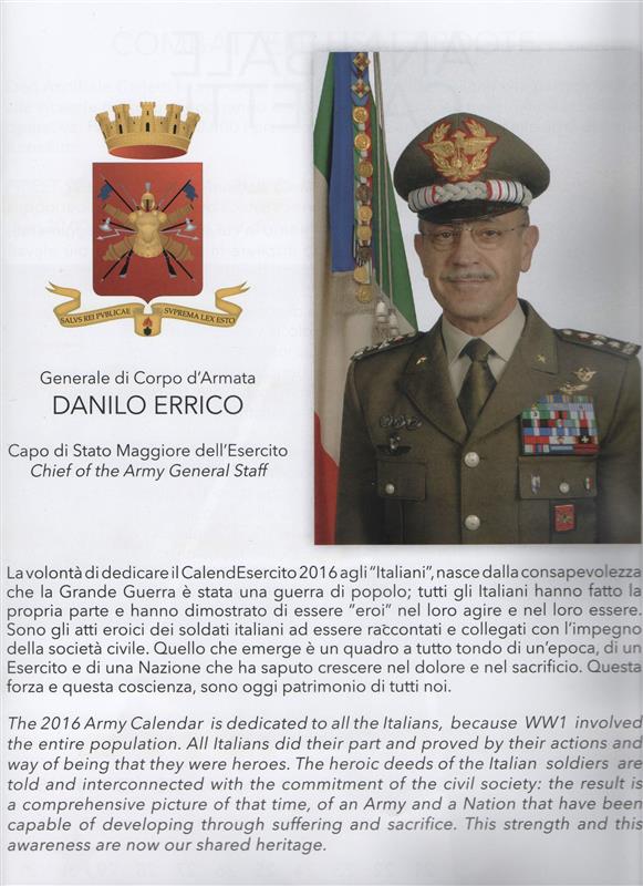 Il CalendEsercito 2016 “ITALIANI”, ideato, prodotto e realizzato interamente dallo Stato Maggiore dell’Esercito, è dedicato a tutti gli italiani che a vario titolo hanno contribuito e partecipato alla Grande Guerra. Milioni i soldati che, chiamati alle armi nel Regio Esercito Italiano, parteciparono alla Vittoria del Paese e vissero con e nell’esercito il primo grande momento di unità nazionale.