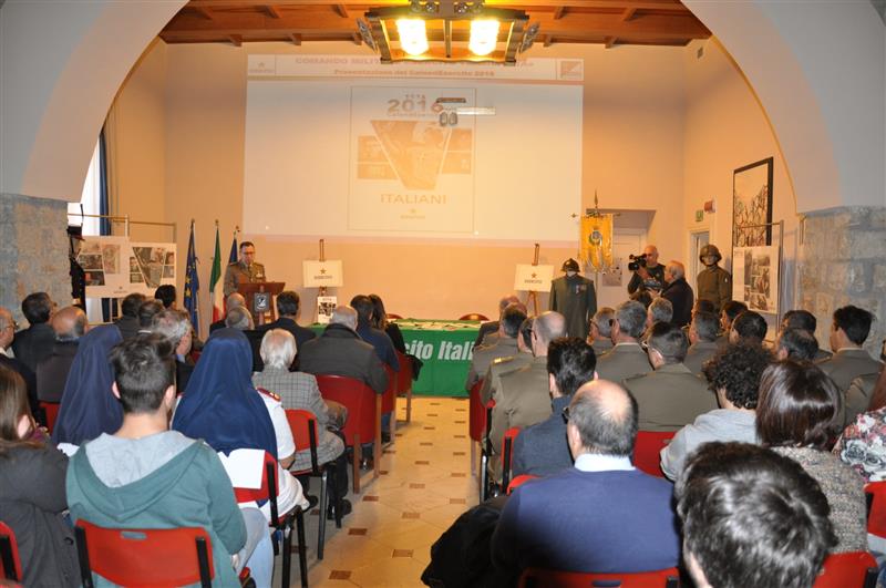 Il Colonnello Ninivaggi, ha illustrato il calendario mese per mese, mettendo in risalto le azioni eroiche dei medagliati, soffermandosi infine a spiegare il logo del centenario della Grande Guerra, nuovo logo istituzionale della Forza Armata, stilisticamente coerente, semplice e d’impatto: la stella a cinque punte che riporta a valori riconosciuti come prevalentemente positivi e che contiene in sé i significati di luce, guida e distinzione.