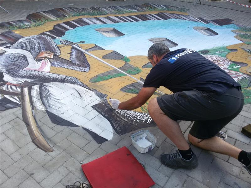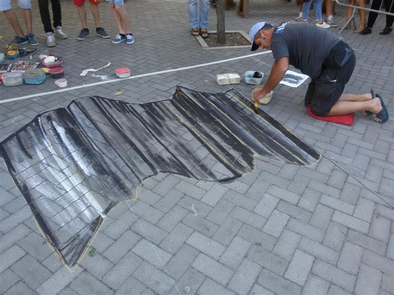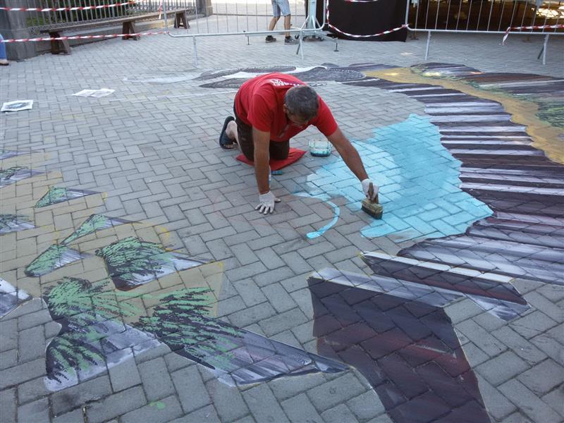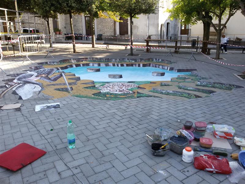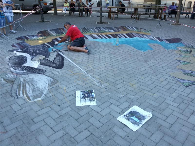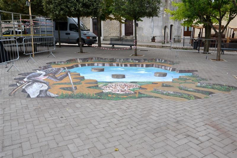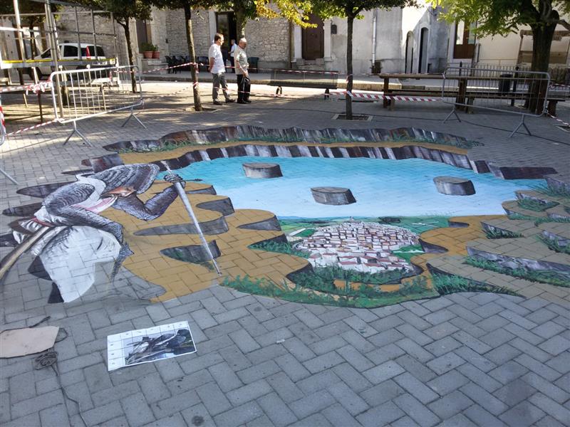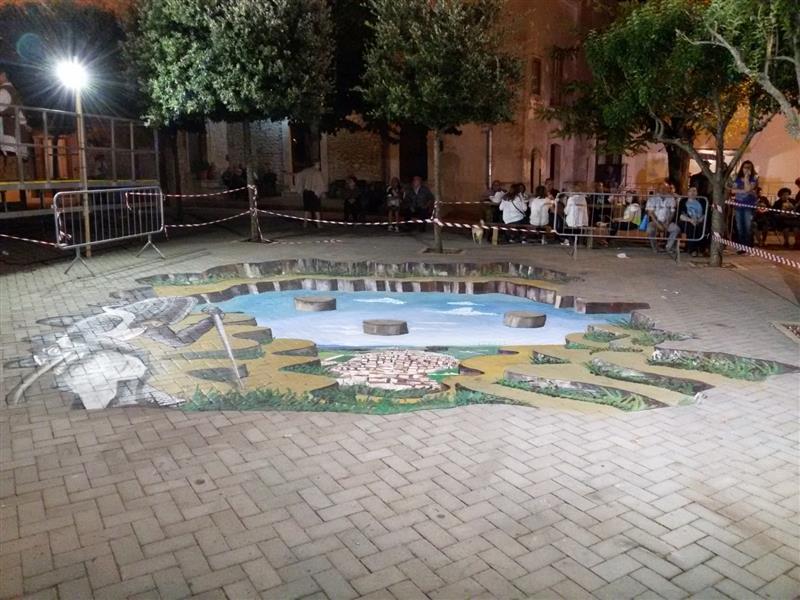 FORENZA (PZ) – Gli abitanti e i turisti di Forenza, in questi giorni d’agosto in cui affollano l’accogliente Piazza Regina Margherita, possono ammirare l’opera di street painting 3D collocata sulla pavimentazione dall’artista napoletano Gennaro Troìa, in arte Jena Soul, che l’ha realizzata in “live painting”, dal 14 al 16 agosto scorsi, utilizzando gessetti colorati e tempere. Il disegno rappresenta una voragine nella quale appare una veduta del paese, che si staglia sul paesaggio circostante con i suoi tetti e il campanile della chiesa madre. A sorvegliare l’abitato un cavaliere templare vestito del tipico abbigliamento, con casacca a sfondo bianco e croce rossa. L’esecuzione dell’opera, resa semi-permanente dalla stesura di colla vinilica, è stata voluta dall’amministrazione comunale di Forenza, in collaborazione con la Scuola Napoletana dei Madonnari e con l’associazione Orme di Venosa.