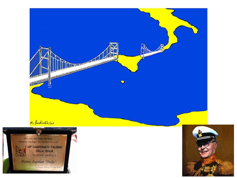 Un inesistente ponte sullo stretto affiancato da un altro ponte che unisce l’Africa alla Sicilia. L’ingegnoso ma bugiardo modo per risolvere il dramma dei migranti che a migliaia continuano a morire nel Meditarraneo è valso all’aviglianese Mario Bochicchio il premio della giuria popolare al 40esimo Campionato italiano della Bugia svoltosi quest’anno a Le Piastre di Pistoia. Il vignettista potentino, sbaragliando u n’agguer rita concorrenza, ottiene il patentino di bugiardo nell’inedita kermesse dal tema «1966-2016, il Giubileo della Bugia: così rifaccio la storia dell’ultimo mezzo secolo», ovvero tutto ciò che è accaduto da cinquant’anni a questa parte, rivisto in chiave bugiarda. «L’Accademia della bugia che rappresento – spiega il Magnifico rettore Emanuele Begliomini - è nata in tempi lontani quando non c’erano le tv e gli abitanti del paesino si radunavano la sera attorno al fuoco e si scambiavano storie che avevano sentito e che trasformavano con la fantasia». Insomma, si raccontavano una serie infinita di bugie, da cui da cui è nata l’idea di istituire un premio annuale in onore di questa bislacca tradizione. «Nei giorni del Festival, nei dintorni di Le Piastre – ci racconta Bochicchio -, è tutto un susseguirsi di bugie: cartelli «falsi» sono piazzati ad arte dagli abitanti, che si divertono un mondo a prendere in giro i malcapitati con segnalazioni di musei egizi, di statue etrusche, di pericoli assolutamente inesistenti tipo «attenti all’orso». È stata davvero una bella esperienza e vincere il premio del pubblico un’enor me soddisfazione». L’artista lucano creativo pubblicitario, pittore, giornalista pubblicista, da anni si dedica alla satira, con la «carriera» di vignettista iniziata fra i banchi di scuola e proseguita nelle varie redazioni locali e nazionali. Le sue vignette sono state pubblicate su numerose riviste mensili come Il Vernacoliere, Lucano Magazine, 100x100 Magazine, su settimanali quali il Giornale Lucano, Controsenso e Il Resto e su quotidiani nazionali come Libero, L’Unità, Il Foglio, Il Sole 24 Ore, nonché su numerosi giornali online, tra cui Dagospia. Bochicchio ha tenuto numerose mostre pittoriche in diverse località italiane, tra cui quelle di maggior rilievo sono state le personali a Roma in via Margutta nella galleria «Il Trittico» ed in via Sistina nella galleria «La Tartaruga». Numerosi i riconoscimenti di questi anni per le sue vignette: nel 2009 a Sant’Agata Dè Goti (Bn) gli è stato assegnato un premio alla carriera; nel 2013, al Festival Internazionale di Ferrara, nell’ambito del concorso «Una vignetta per l’Europa», ha ricevuto il Premio speciale del pubblico; nel 2014 l’Ucsi Basilicata gli ha consegnato una targa e nel 2015 si è classificato 3°, su 548 vignettisti di 52 stati, ,al Festival Internazionale dell’Economia di Trento.