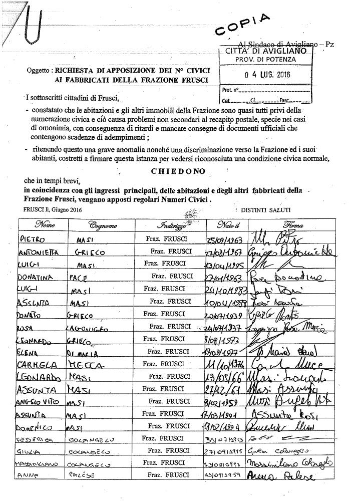 AVIGLIANO - Finora nessuna risposta alla richiesta fatta dai cittadini di Frusci, attraverso una petizione popolare, nel chiedere al Comune di Avigliano di affiggere i numeri civici. A sottolinearlo è Luigi Masi a nome di 40 cittadini “essendo un diritto, presso le abitazioni al fine di non incappare in ritardi o ,peggio, in una mancata consegna della posta (soprattutto per notifiche urgenti) e per evitare continui errori di consegna, al fine di proteggere il diritto alla privacy”. Nel sollecito inviato alla amministrazione comunale Summa firmato da Masi, tra i promotori dell’iniziativa si indica fine anno come termine ultimo prima di intraprendere un’azione legale collettiva.