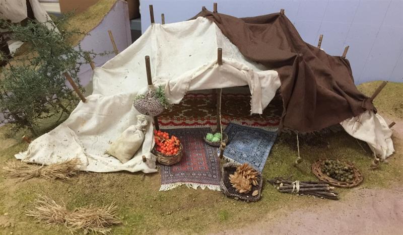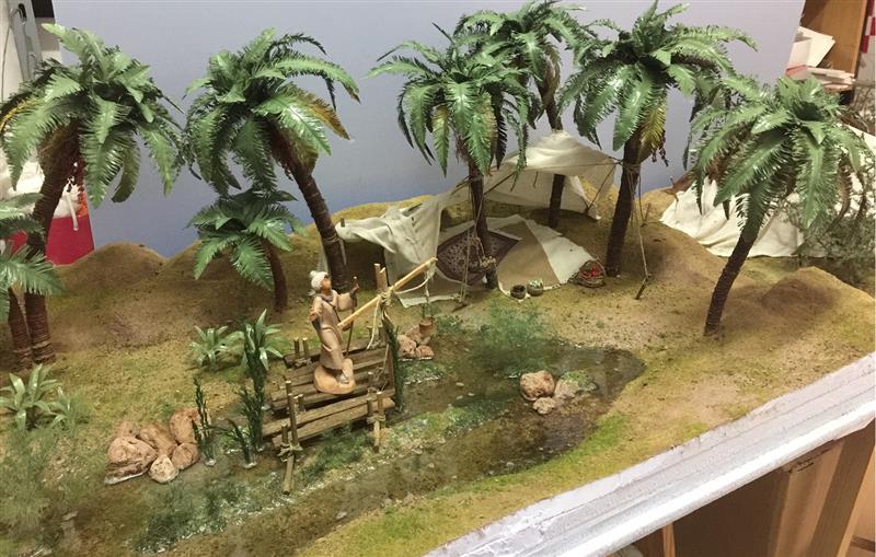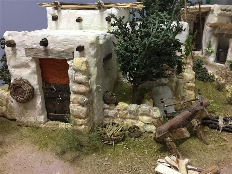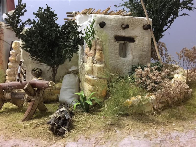 La fantasia dei nostri due esperti presepisti ha voluto, all’interno dello scenario, ambientare i pastori nei luoghi più disparati e vari personaggi impegnati nelle più svariate attività della vita umana del tempo, in uno scenario naturale e desertico tipico del medio-oriente.