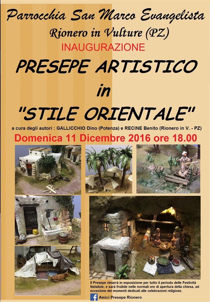 Quest'anno nella parrocchia San Marco Evangelista di Rionero in Vulture, l'estro artistico di Recine Benito e Gallicchio Gerardo ha realizzato un presepe di stile orientale ispirato all'ambiente palestinese del tempo in cui nacque Gesù.