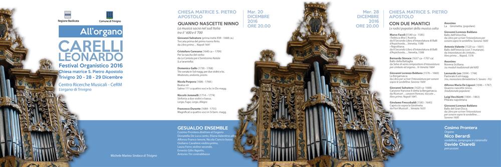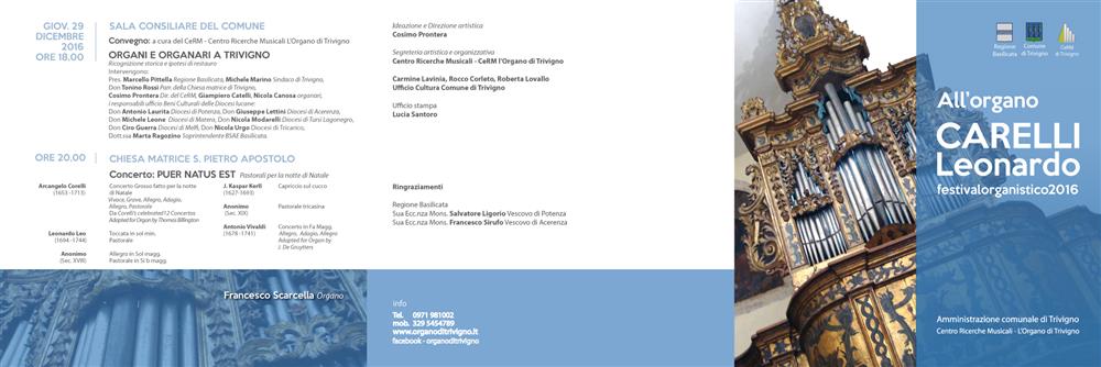 Il programma del festival prevede quattro appuntamenti con sempre al centro la macchina del Carelli. Tre concerti e un momento di approfondimento, la tavola rotonda dal titolo “Organi e Organari a Trivigno” - iniziativa di grande importanza e interesse, che si terrà Giovedì 29 Dicembre 2016 - ore 18.00 presso la sala consiliare del Comune di Trivigno – a cui i responsabili del CeRM tengono particolarmente.