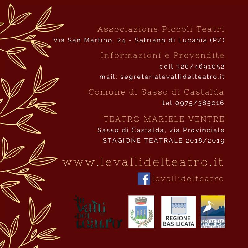 SASSO DI CASTALDA - Si alza il sipario su una nuova edizione de “Le Valli del Teatro”, la rassegna teatrale organizzata dall'Associazione Piccoli Teatri che tra gennaio e marzo porterà la magia del teatro al Mariele Ventre, con sei spettacoli selezionati con la consueta cura dal Direttore Artistico, Domenico De Rosa. Ad aprire la rassegna sarà domenica 20 Gennaio, ore 18:00, “Questi fantasmi” di Eduardo De Filippo nella versione della Compagnia A.R.S. Nova. La compagnia salernitana, guidata dalla regia di Ugo Piastrella, proporrà una lettura molto tradizionale e fedele del testo di Eduardo, tra i più difficili ed importanti del grande maestro, tutto giocato su un perfetto equilibrio tra comico e tragico e su uno dei temi centrali della drammaturgia eduardiana: quello della vita messa fra parentesi, sostituita da un travestimento, da una maschera. Il 26 gennaio la rassegna continuerà con “Un leggero malessere” di Harold Pinter e la regia di Eros Pascale, spettacolo selezionato per l’European Young Theatre 2018 Festival dei due Mondi di Spoleto. Il 17 febbraio spazio allo Stivalaccio Teatro e al suo “Romeo e Giuletta” una vera e propria commedia dell’arte moderna in cui il teatro nel teatro si mescola con la storia di Shakespeare in un continuo dialogo comico tra gli interpreti e con il pubblico. Sabato 23 Febbraio sarà il momento di “Pane, latte e lacrime”, di e con Veronica Liberale ambientato a Roma nel popolare quartiere di San Lorenzo nei giorni precedenti il tragico bombardamento del 19 luglio 1943. Il 17 marzo si continuerà con Goldoni e i suoi “Gl’innamorati” con Marco Lorenzi a guidare e dirigere il nutrito e giovane gruppo di attori della compagnia Il Mulino di Amleto. A chiudere la rassegna il 30 Marzo sarà "L’estranea di casa", pluripremiato spettacolo tutto al femminile, scritto, diretto ed interpretato dalla talentuosa Raffaella Giancipoli. Gli spettacoli inizieranno alle ore 21:00 il sabato e alle 18:00 la domenica. La rassegna è realizzata con il sostegno del Comune di Sasso, Regione Basilicata e Parco Nazionale dell’Appennino Lucano. Info e prevendite su www.levallidelteatro.it.