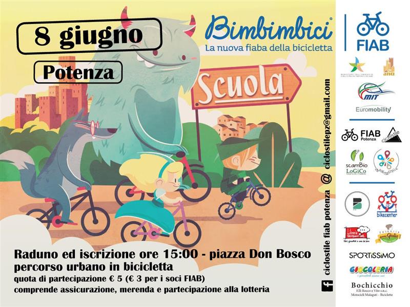 Giunta alla sua 20^ edizione è la manifestazione promossa da FIAB (Federazione Italiana Ambiente e Bicicletta) nata per sensibilizzare ragazzi e adulti su temi come la sicurezza sulle strade delle nostre città, la moderazione del traffico, la salute e la vivibilità dei nostri centri urbani. Questa edizione ha un valore aggiunto: darà il via ad una manifestazione del tutto nuova, unica nel suo genere, la "Festa del gioco di Strada" che si svolgerà dall'8 all'11 giugno 2019 a Potenza nell'ambito del Progetto "Un, due, tre stelle". " E' una occasione importante e imperdibile per incoraggiare le famiglie a sperimentare uno stile di vita diverso per un giorno, per fare movimento e consumare una sana merenda in compagnia" spiega il Presidente dell'Associazione Manuela Lapenta “iniziative come questa possono aiutare a vincere le resistenze e i pregiudizi nei confronti di un mezzo di trasporto quotidiano poco utilizzato nella nostra città, l'idea è anche quella di stimolare stili idi vita diversi e più salutari grazie a una merenda biologica a Km Zero” Il corteo a pedali partirà da Piazza Don Bosco in direzione San Rocco con rientro e sosta da scamBIOlogico, dove i partecipanti potranno consumare una merenda sana a base di frutta e yogurt da bere a KM0 (Fattorie Donna Giulia) per recuperare le forze. Il percorso sarò chiuso al traffico motorizzato, avremo il supporto dei Vigili Urbani, per cui pedaleremo sicuri e spensierati!! I più piccoli potranno restare in Piazza a cimentarsi in percorsi di abilità protetti. L'appuntamento alle 15:00 in Piazza Don Bosco per il raduno e la registrazione (obbligatoria) dei partecipanti. Controllate che le vostre bici siano in buono stato e pronte a partire!! Ecco il percorso: Piazza Don Bosco, Viale Firenze, Via di Giura, Via Lazio, Via Ciccotti, Corso Cavour, San Rocco (rotonda e rientro), Corso Cavour, Via Ciccotti – Via Sicilia – Piazzale Stazione Superiore (sosta merenda c/o ScamBio Logico) – Via Sicilia – Via Ciccotti – Sottopasso FAL, Via Angilla Vecchia, Piazza Don Bosco). Al termine della pedalata i partecipanti assisteranno all'estrazione dei premi messi in palio dagli sponsor: Bike Center, Fratelli Bochicchio, Libreria Senzanome, Maggio Giocattoli-Giocoleria, Sportissimo, ciclOstile FIAB Potenza, Bike Zoo.