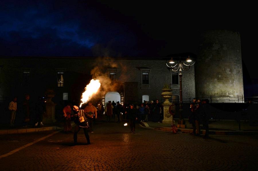 VENOSA (PZ) – Lo scorso 30 dicembre si è svolto a Venosa, all’interno del Castello ducale “Pirro del Balzo”, l’evento “Il Castello animato. Il Medioevo prende vita”, promosso dal Comune di Venosa e organizzato da Artistica Management all’interno del cartellone natalizio “Venosa, che spettacolo! Racconti di musica e teatro”. Brevi drammatizzazioni e scene di vita quotidiana, performance artistiche e di musica medievale, visite guidate, spettacoli con il fuoco si sono susseguiti per tutto il pomeriggio e fino a sera, per celebrare l’imminente arrivo del 2020, anno in cui si celebrano i 550 anni dalla costruzione del maniero da parte del duca Pirro del Balzo. A popolare “Il Castello animato” giocolieri, musici e numerosi altri personaggi in costumi medievali, che hanno riportato il Castello ducale di Venosa ai suoi più antichi fasti, al tempo in cui, sul finire del XV secolo, le sue stanze erano abitate da Pirro del Balzo, figlio di Francesco duca di Andria, e da sua moglie Maria Donata Orsini, figlia di Gabriele Orsini principe di Taranto. Momento culmine della rievocazione è stata proprio l’uscita dei due duchi, insieme alla loro figlia ultimogenita Isabella, futura regina di Napoli. Al cospetto della famiglia ducale, il gruppo Odor Rosae Musices, diretto dal maestro Fabio Anti, ha eseguito alcuni brani di musica medievale, recuperati attraverso ricerche storico-filologiche e trascrizioni da testi antichi, utilizzando fedeli riproduzioni di strumenti d’epoca. Ad assistere all’anteprima dei festeggiamenti che avverranno nel 2020 una nutrita schiera di curiosi, grandi e piccoli, giunti anche dai comuni limitrofi. Alcuni degli strumenti medievali creati dal maestro Fabio Anti sono stati esposti all’interno della Sala “Carlo Gesualdo”, dove si sono tenuti altri brevi concerti che, attraverso il suono di antiche melodie, hanno catapultato il pubblico in un’altra epoca, facendo rivivere lo spirito medievale che ancora aleggia tra le mura del Castello. L’iniziativa ha visto la partecipazione dell’Associazione culturale “Liu.Bo” e del Gruppo sbandieratori e musici “Puer Apuliae”, entrambi di Lucera (FG). A disposizione dei visitatori anche la possibilità di effettuare una visita gratuita per conoscere la storia e i segreti del Castello, con l’accompagnamento di una guida turistica. Il Castello ducale di Venosa fu fatto erigere da Pirro del Balzo tra il 1460 e il 1470, dopo l’abbattimento di una preesistente cattedrale romanica dedicata a San Felice, a sua volta edificata nell’XI secolo sui resti di alcune cisterne romane. Da fortezza fu trasformato in dimora signorile da Carlo Gesualdo, il noto “principe madrigalista” che nel Cinquecento fece risuonare, per gli ampi e sontuosi spazi castellari, le sue composizioni musicali polifoniche. In origine l’aspetto del Castello era ben lontano da quello odierno. Attualmente presenta una pianta quadrangolare, con torri cilindriche agli angoli, un profondo fossato, un ponte d’accesso in pietra e un ampio cortile circondato da un loggiato rinascimentale. La merlatura della torre di ponente reca lo stemma di un sole raggiante, simbolo di Pirro del Balzo Orsini.